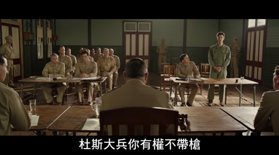 這是電影中唯一的插述點,下得巧妙無比,對整體劇情而言,發揮到承先啟後的效果,承的是戴斯蒙不拿槍的合理性,啟的是戴斯蒙拯救同胞的奇蹟。
